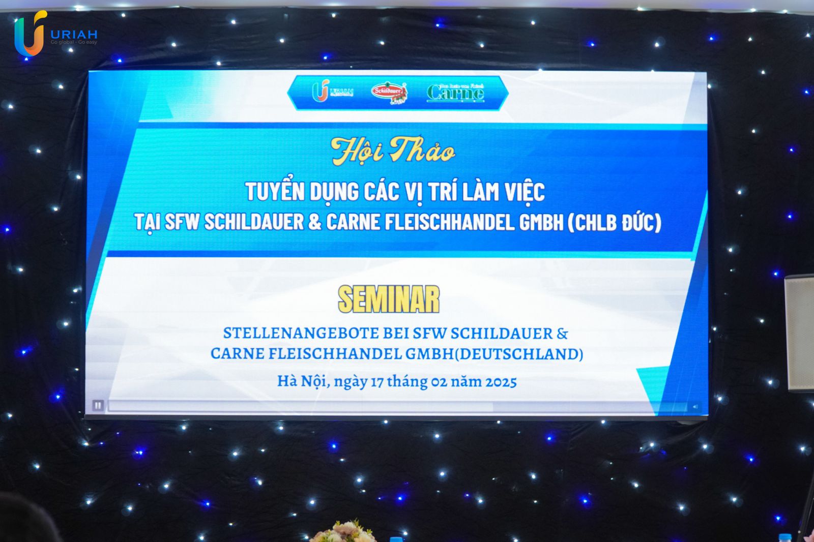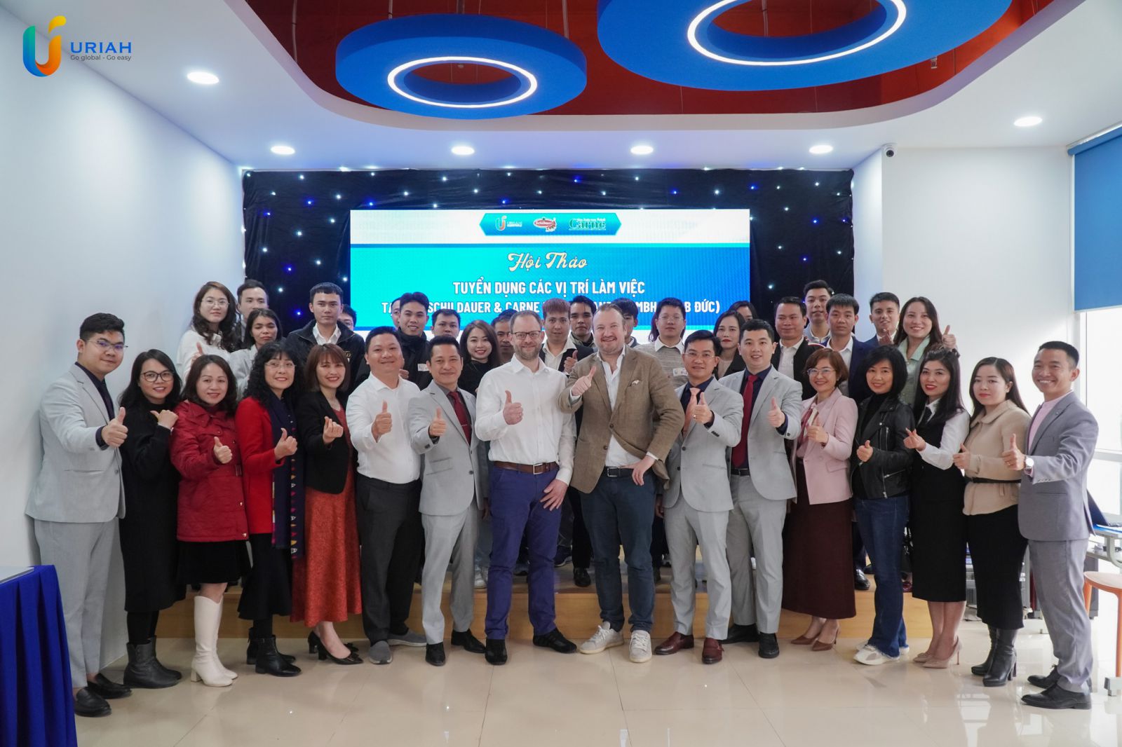 Ngày 17/02 vừa qua, Uriah đã tổ chức thành công Hội thảo tuyển dụng các vị trí làm việc tại SFW Schildauer & Carne Fleischhandel (CHLB Đức). Sự kiện mở ra cơ hội việc làm hấp dẫn cho người lao động Việt Nam, giúp họ tiếp cận trực tiếp với các nhà tuyển dụng tại Đức. Hội thảo không chỉ mang đến thông tin chi tiết về các vị trí tuyển dụng mà còn giúp ứng viên có cái nhìn rõ hơn về chế độ phúc lợi, lộ trình phát triển sự nghiệp và cơ hội định cư lâu dài tại Đức.