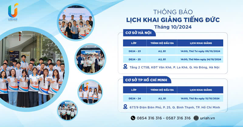 Uriah gửi bạn lịch khai giảng các lớp tiếng Đức trong tháng 10/2024 để các bạn sắp xếp thời gian tham gia và sẵn sàng chinh phục tiếng Đức.